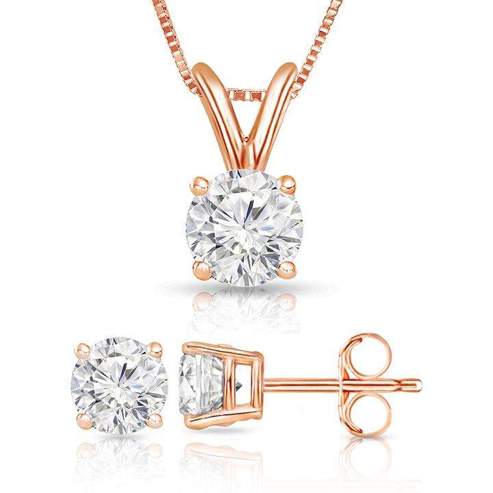 Hand set in New York City with 14k Rose Gold 4 Prong setting. For Stud (0.20ctw) each stone is of 0.10 ctw & 2.90mm and Pendant is 0.13ctw & 3.05mm. All our diamonds are conflict free diamonds. Packaged into a fabulous velvet package for your storing pleasure.