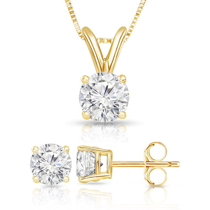 Hand set in New York City with 14k Yellow Gold 4 Prong setting. For Stud (0.20ctw) each stone is of 0.10 ctw & 2.90mm and Pendant is 0.13ctw & 3.05mm. All our diamonds are conflict free diamonds. Packaged into a fabulous velvet package for your storing pleasure.