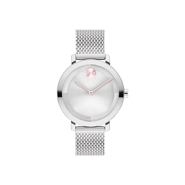 Crafted from stainless steel, this sleek women's watch features a 34mm case that houses a captivating micro-textured dial with a glossy lacquer overlay, slim hands and our iconic dot motif at 12 o’clock in blush. The matching mesh bracelet completes the design with a minimalist edge.