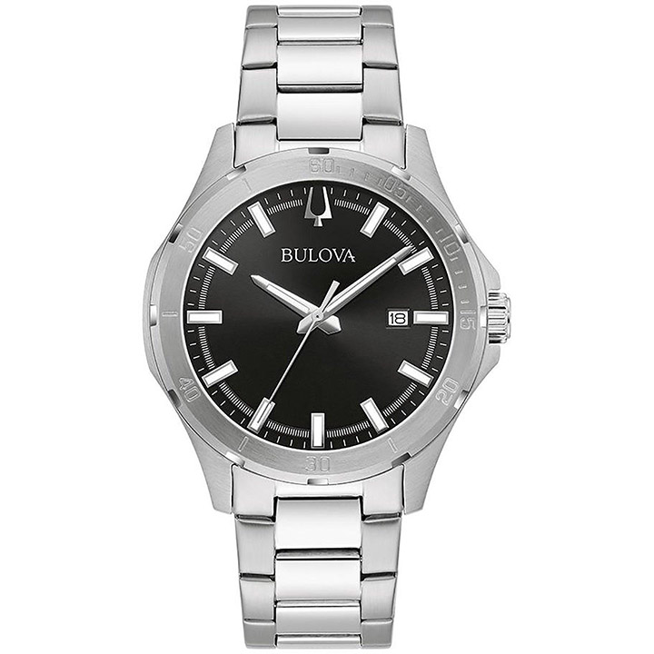 This Bulova watch is a handsome timepiece for a tailored look. It features a 40mm stainless-steel case, black dial with three hands and a date window, mineral crystal, and a stainless-steel bracelet. Water resistant to 30M.