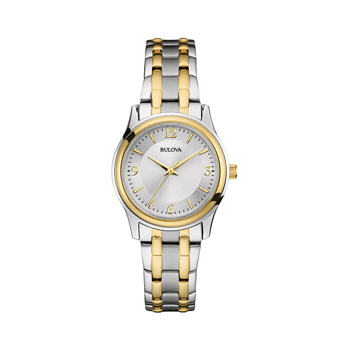 This classy women’s two-tone watch from Bulova will dress up a casual outfit or go perfectly with something more formal. It has a stainless-steel 30mm case and bracelet and a patterned silver-tone dial with gold Arabic numerals. Water resistant to 30M.