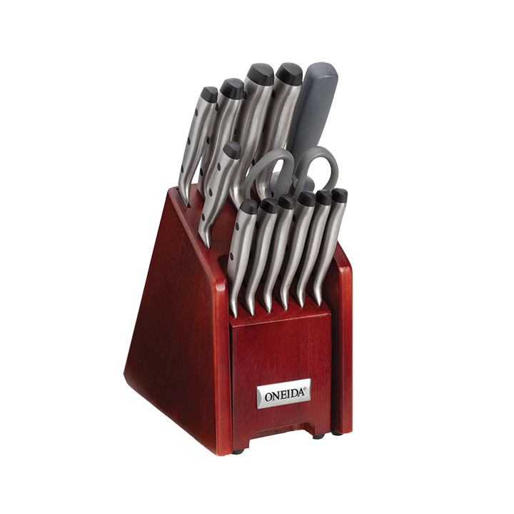 The Pro Series 14-piece stainless-steel cutlery set from Oneida is meant for those who feel truly at home in the kitchen. It features stunning silver handles accented with black tips to create a modern design, along with a sharp and professional shape. The set includes an 8” chef’s knife, 8” bread knife, 7” santoku knife, 5” utility knife, 3.5” paring knife, kitchen shears, six 4.5” steak knives, honing steel, and a hardwood block.