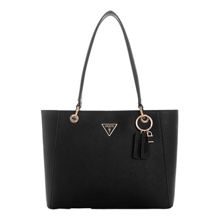 Made in saffiano faux-leather construction, this large tote from Guess Handbags features a front triangle logo emblem and a zip-top closure. It has a back slip pocket, interior back zip pocket, removable logo keychain, and shiny gold hardware. It measures 14.5” x 3.75” x 10.25” with a 10.25” shoulder drop.