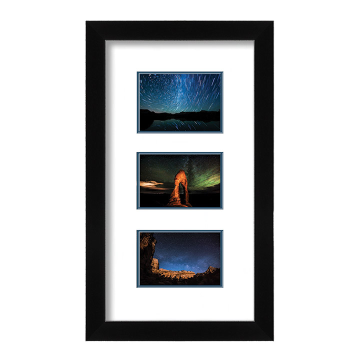These three Starry Nights photos are all printed and matted together as one harmonious wall hanging. Created by Scott Barlow, the works of art all feature natural landscapes with starry night skies. The piece measures 13” x 21” and are matted and framed under glass so you can hang it on your wall right away