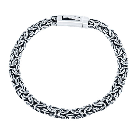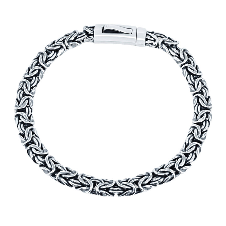 This flat Byzantine bracelet by Parikhs showcases intricate links finished in radiant rhodium plating over 925 sterling silver. Secured with a sleek bar lock, it blends timeless craftsmanship with modern elegance for everyday wear.