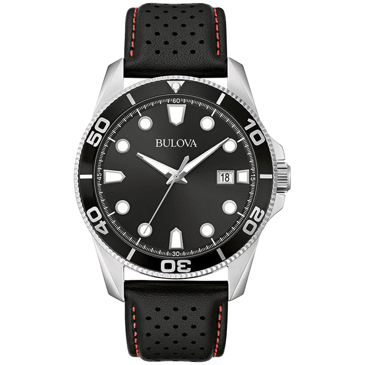 This sleek men’s black leather strap watch has a gold-tone, stainless-steel 38mm case with a black dial, gold bezel, diamond at the 12:00 position, and a black leather strap. Water resistant to 30M.