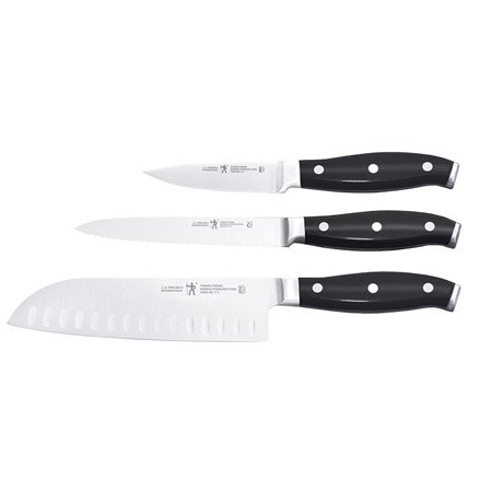 The J.A. Henckels forged Premio 3-piece starter knife set has a professional look with a satin finish, forged blade, and full bolster. The ergonomic handle design has a comfortable grip and is contoured to a full tang with a 3-rivet handle. The set includes a 3” paring knife, a 5” serrated knife, and a 7” santoku knife.