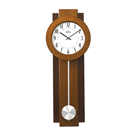 With a wooden case, two-tone walnut and mahogany finish and an off-white dial, this wall clock from Bulova adds a touch of classic style to your home or office. A brushed silver-tone finish engraving plate is included. Measures 8.75” x 3” x 23.5”.