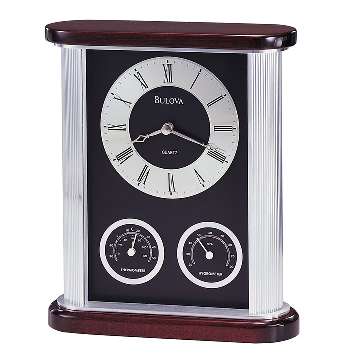 Solid wood top and base, high gloss piano finish over mahogany stain. Silver-tone finish ribbed metal sides. Raised chapter ring dial with open fret spade hands. Includes clock, thermometer with Fahrenheit and Celsius scales, and hygrometer. Protective glass lens. Engraving plate included. Requires (1) AA battery, not included. Engraving plate included: 3.25" x .75", 8.26cm x 1.91cm