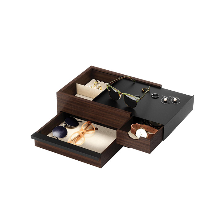Use the Umbra Stowit storage box to keep all your favorite jewelry pieces in one place. Each drawer features a linen pad to keep your jewelry in place. This lovely box is sourced from renewable wood and made with an eco-friendlier finish. Measures 10.2” x 8.7” x 4.7”.