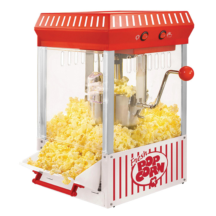 Popcorn has never tasted so good at home! The vintage 10-cup table-top popcorn maker from Nostalgia is a unique take on vintage popcorn cards from the early 19th century. The stainless-steel kettle holds 2.5-ounce of popcorn kernels with a built-in kernel stirring system. Measures 14” x 12” x 19”. Includes a kernel measuring cup, oil measuring spoon, and popcorn scoop.
