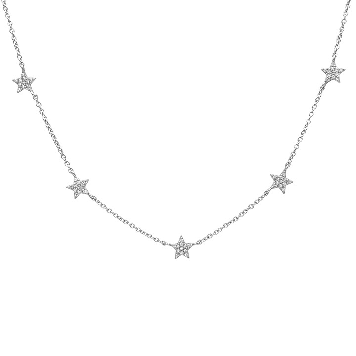 Antwerp’s beautiful “5 Stars” necklace features five individual star designs spaced out 1.5” apart along the base of the necklace. Each star is set with multiple small cubic zirconia in a pavĂ© style. The necklace measures 16” long.