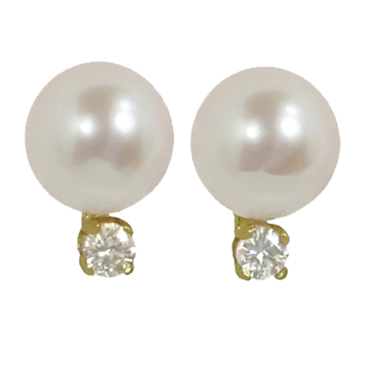 Perfectly elegant diamond and pearl earrings set in 14kt yellow gold. Earrings are made with two 5-5.5mm pearls and 2 diamonds totaling .06cttw. The diamonds are cut to perfection in Antwerp, Diamond Capital of the World. Every diamond is set by hand by master craftsmen.