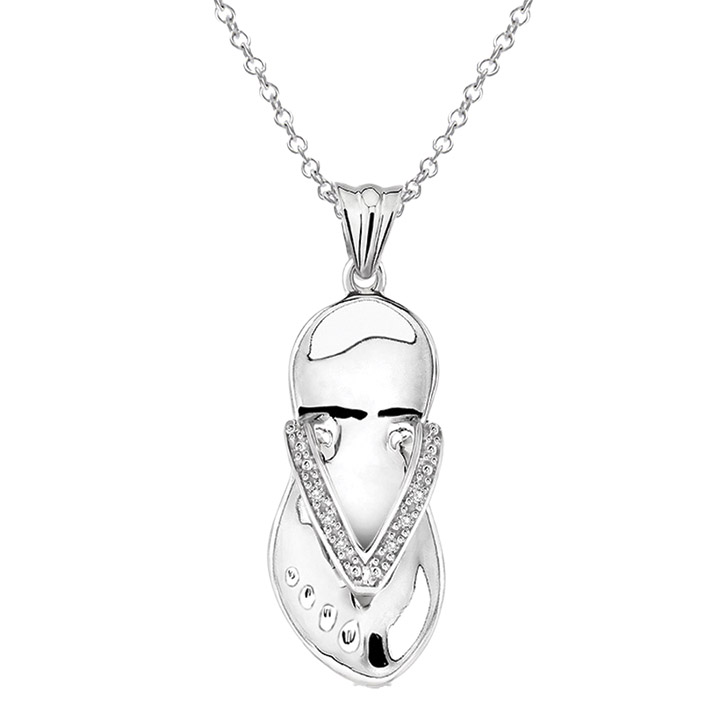 It’s summer every day of the year with this pretty diamond flip-flop pendant. It features a total of .03 carats of round diamonds set in sterling silver and suspended from an 18” cable chain with a spring-ring clasp.