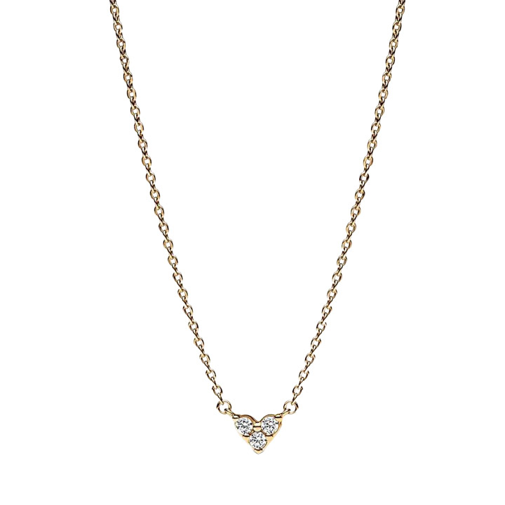 The delicate, sparkling stones of this Pandora 14K gold-plated necklace take their inspiration from everlasting love. The new Pandora Timeless design arranges three round brilliant-cut stones into an elegant and refined heart-shaped style. Wear it alone for subtle sparkle or layer it with other styles.