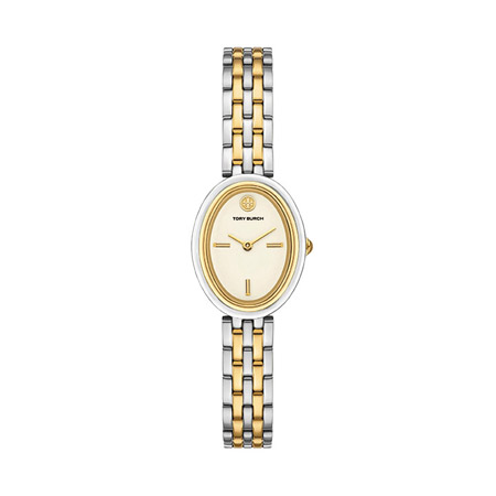 The Oval watch from Tory Burch exudes elegance with the gold- and silver-tone stainless steel 5-link bracelet and bezel case. The cream oval dial with gold-tone markers and hands match beautifully on the 22mm x 28mm case.