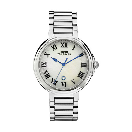 This 42mm watch features a stainless steel case and bracelet, white pattern dial with Roman numerals and is water resistant to 165'.
