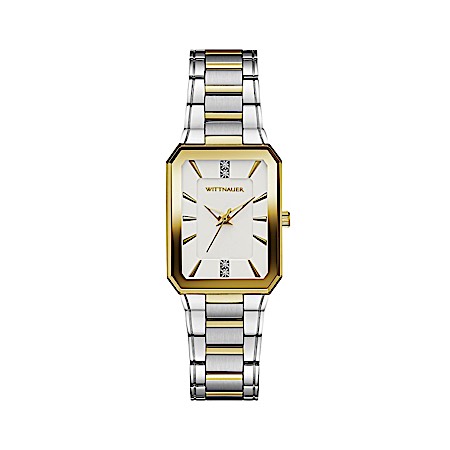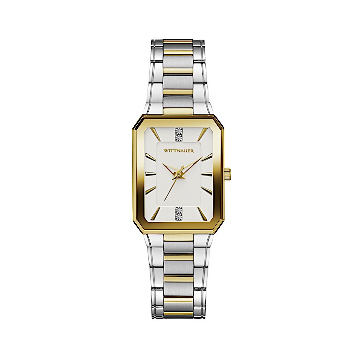 Get a new slant on modern design. Double-layered silver-white dimensional dial gleams with 4 diamonds applied to 12 and 6 o'clock markers. A sleek-and-slim gold-tone stainless steel rectangular case with cut corners boasts a beveled crystal with edge-to-edge gold-tone metallization and screw-back case. The three-link two-tone gold and stainless steel bracelet has a double-press deployant closure. Water resistance to 50M.Diameter: 23mm X 36mm Thickness: 6.35mm
