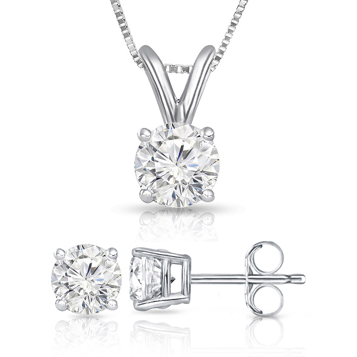 Hand set in New York City, this set features 14k white gold 4-prong settings with .10ctw earrings that measure 2.9mm and a .13ctw pendant that measures 3.05mm. A gorgeous addition to any jewelry collection.