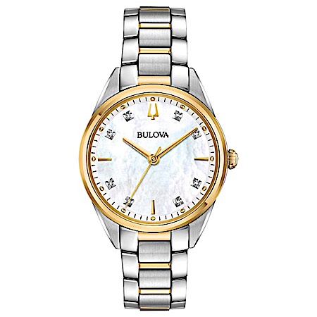 Slim stainless steel and gold-tone case, lustrous white mother-of-pearl three-hand dial with 8 diamonds, domed sapphire crystal, stainless steel and gold-tone bracelet with push-button deployant clasp, quartz movement, and water resistance to 30 meters. Diameter: 32mm Thickness: 8.4mm