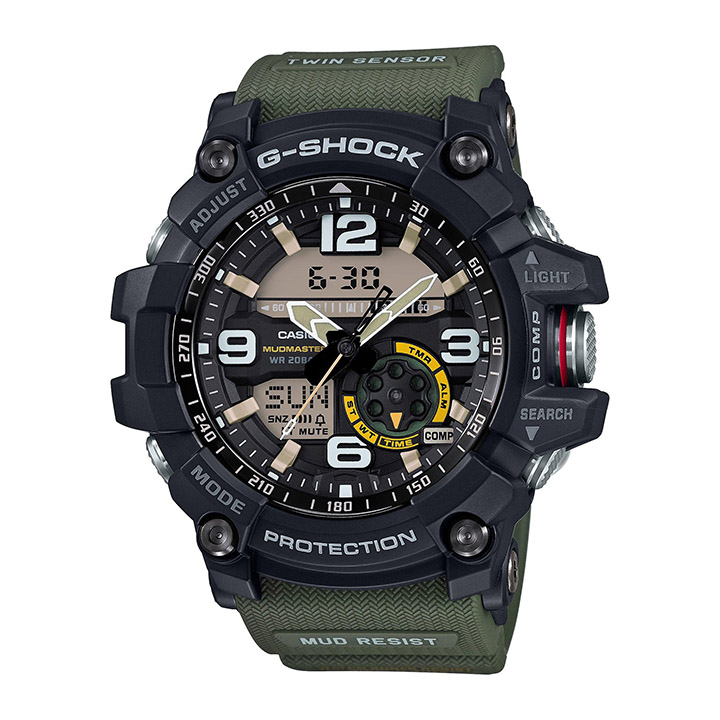 Twin Sensor capabilities provide compass and thermometer. Multiple gaskets on the pipes guide buttons and shafts to keep mud out. Super Illuminator. World time - 31 time zones. 1/100 Second stopwatch. Countdown timer. 5 Daily alarms with 1 sno ouncee alarm. Full auto calendar. Hourly time signal. Analog display with 3 hands. Digital display shows time and date. Green band resembles a cloth band texture. Black resin case and stainless steel bezel. Mud and Shock resistant. Water resistant to 200 M. Case size: 56.2mm x 55.3mm x 17.3mm.