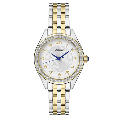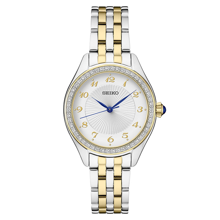 Essentials watches from the Crystal collection are made with Swarovski crystals. Gold and silver-tone 5-link stainless steel bracelet and case. White patterned dial with gold-tone Arabic numerals. Bezel is fully paved with sparkling Swarovski crystals. Three blue hands. Blue cabochon crown. Push button fold over deployant closure. Case size: 29mm. Water resistant to 50 M.