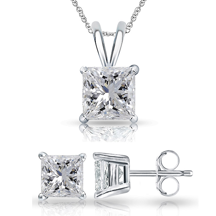 This diamond solitaire set is simple, classic and stunning. It features princess-cut diamonds set in stud earrings and on a 14k white-gold chain. The diamonds are .10-carat, “IJ” color and “SI1” clarity.