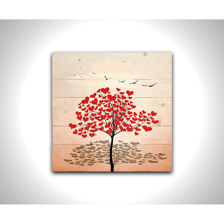 Add a touch of elegance to your living space with "Love Tree Shadow III" by Hal Halli. This stunning graphic art depicts a tree embellished with red hearts as leaves, set against a charming pink and white background with birds flying by. Handcrafted by a skilled artist in the USA, it's the perfect way to add a whimsical charm to your home decor. 24" x 24" Image size.