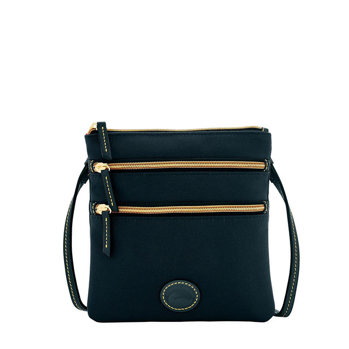 Dooney & Bourke’s nylon North South triple-zip bag is lightweight and extremely durable. A more substantial weave provides extra reinforcement that allows this collection to better maintain its profile. High-impact hues, shiny gold-tone hardware, and russet leather trim make this the perfect carryall for every day. It measures 8” x .25” x 8” with a 24” strap drop.