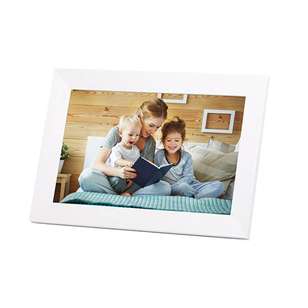 With the Bell + Howell smart photo frame and integrated Frameo app, you can receive pictures and videos of family and friends on your frame from anywhere in the world. The photos and videos appear on the screen within seconds so you can enjoy the moments while they happen. The intuitive touch screen and user-friendly interface simplify making slideshows. Features 16GB of built-in memory to store up to 4,000 photos and videos. Measures 10.5” x 1.2” x 7.3”.