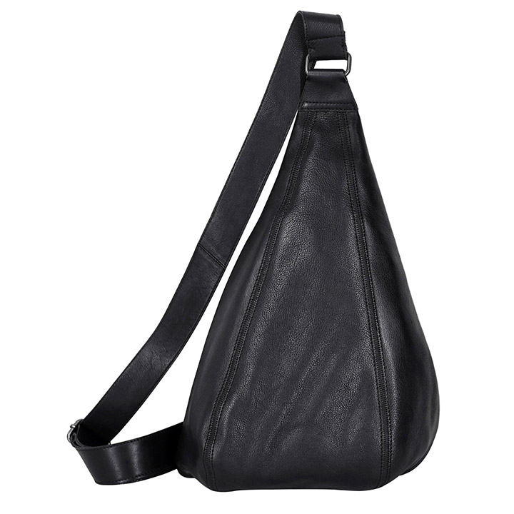 This black hippie leather sling/backpack from Latico Leathers is made of 100% full-grain leather, with a relaxed 1.5” wide single strap, top zip entry, and exterior cell phone pocket. Spacious yet sleek, it develops a signature patina that grows more beautiful with age. Measures 17.5” x 4” x 9”.