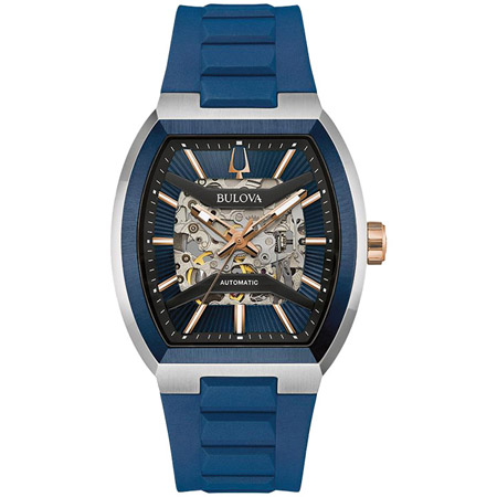 This Bulova men’s watch offers daringly avant-garde design. The watch features a 40mm rose gold- and silver-tone tonneau-shaped stainless steel case with a double-curved sapphire crystal, a blue bezel, and a blue rubber strap with a pin-buckle closure. The blue patterned dial with black dial ring and bridges has rose-gold-tone hands and markers with luminescent fill and a central aperture revealing the inner workings of the 21-jewel automatic skeletonized movement.